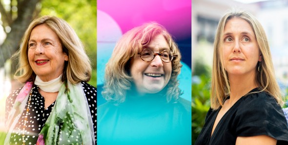 Left to right: Mary Landergan, professor in the school of law, Laurel Leff, professor of journalism and Margo Lindauer, director of the Domestic Violence Institute at Northeastern’s School of Law. Photos by Matthew Modoono/Northeastern University and Ruby Wallau/Northeastern University