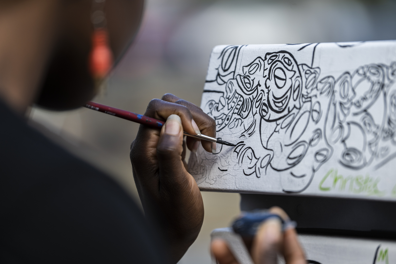 Charlot gave the nearly 5-foot tall utility box two coats of white paint, then penciled in the mural on all sides of the box. After painting black outlines over the penciled mural, Charlot began bringing the mural to life by splashing bold, colorful paint strokes of red, pink, brick brown, green and gray.
