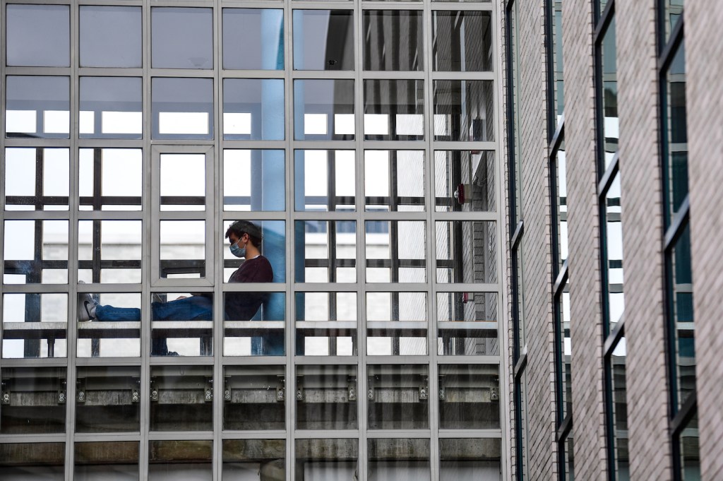 A member of the Northeastern community, hard at work, is visible through the glass hallways of Kariotis Hall. Photo by Alyssa Stone/Northeastern University