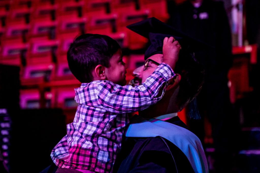 The son of a College of Professional Studies doctoral graduate plays with his father’s cap during a reception after the hooding ceremony in Northeastern’s Matthews Arena. Photo by Alyssa Stone/Northeastern University