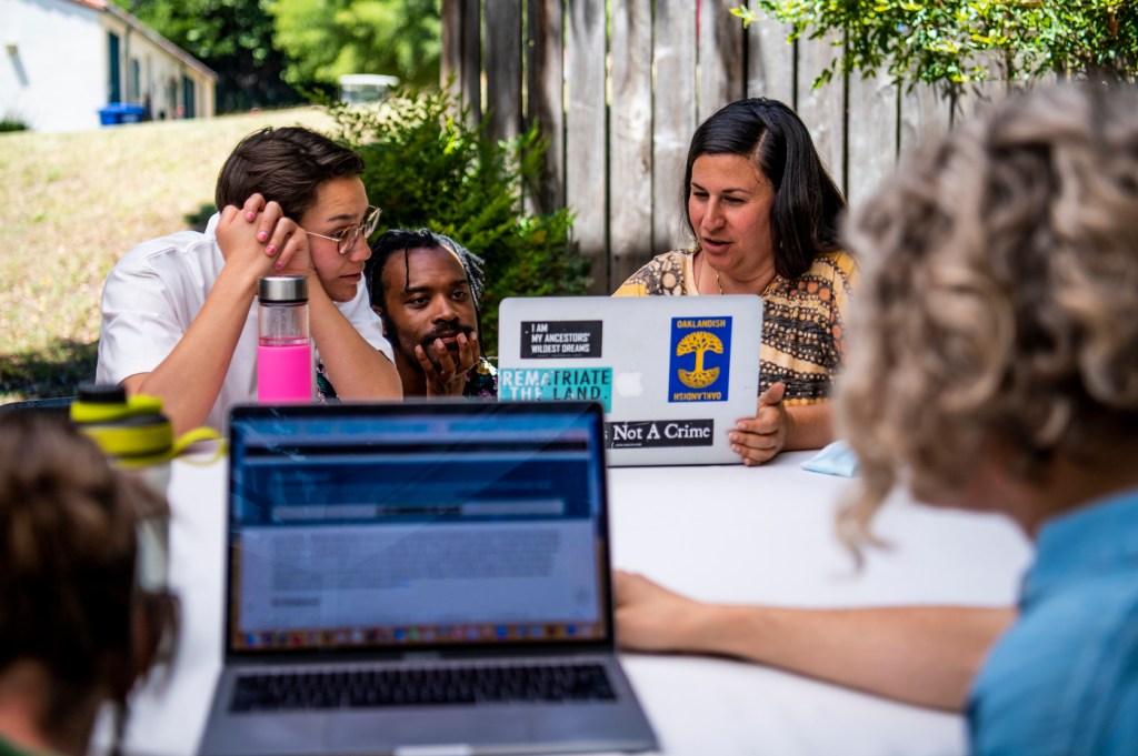 MEET, Master of Arts in Education, Emphasis in Teaching, graduate students work in small groups at Reinhardt Alumnae House at Mills in Oakland, California. All students in the MEET year are employed as either full- or part-time teachers. Photo by Alyssa Stone/Northeastern University