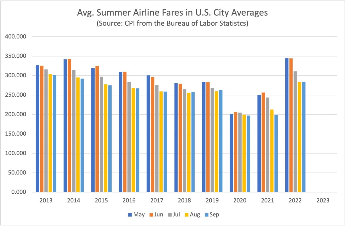 The cost of summer flights is also increasing after a fall in 2020. Last year, the average price for a flight between late May and mid-September was $313, up from $232 during the same time in 2021 and $201 in 2020, according to the Bureau of Labor Statistics.