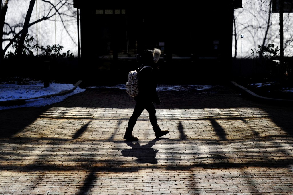 A student walks past the Snell Engineering Center in the bitter cold on Monday. Photo by Matthew Modoono/Northeastern University