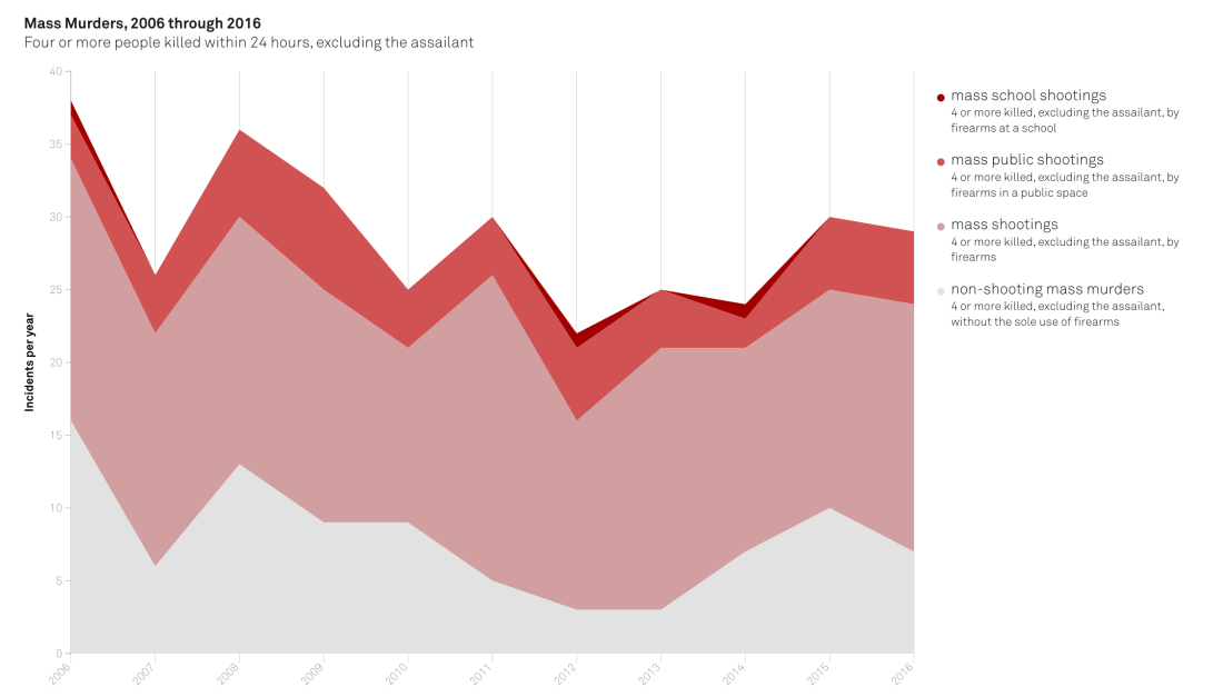Fridel and Fox used data collected by USA Today, the FBI’s Supplementary Homicide Report, Congressional Research Service, Gun Violence Archive, Stanford Geospatial Center and Stanford Libraries, Mother Jones, Everytown for Gun Safety, and a NYPD report on active shooters.