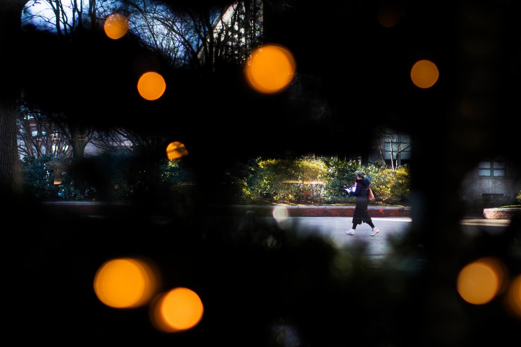 A student walks by the Curry Student Center as seen through holiday lights on Tuesday. Photo by Adam Glanzman/Northeastern University