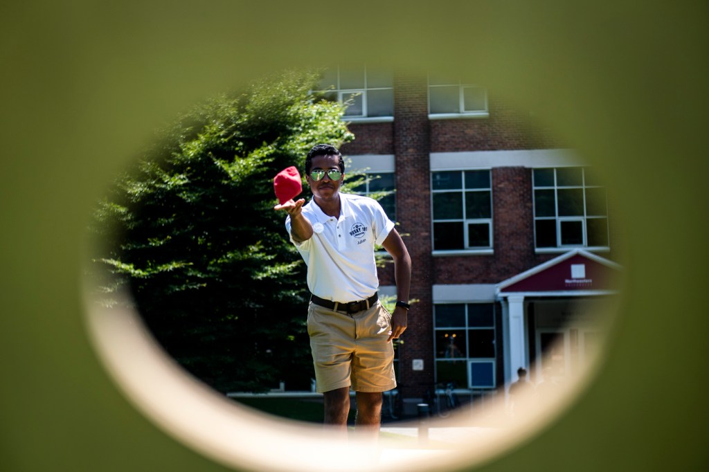 Orientation leader Julian Peña plays cornhole on Centennial Common as part of an orientation session for incoming students. Photo by Ruby Wallau/Northeastern University
